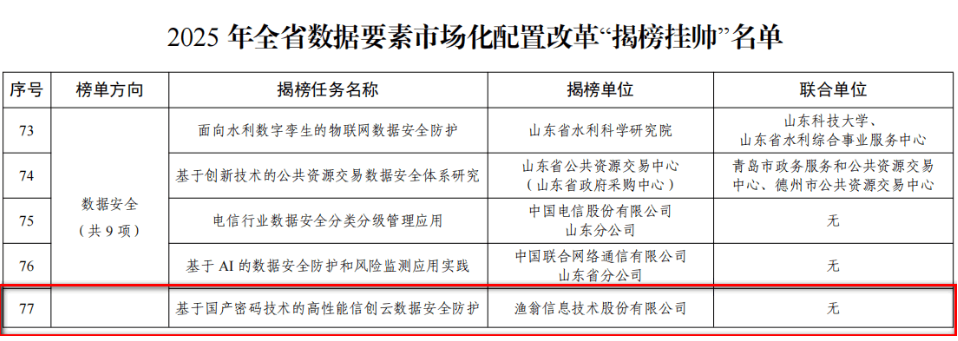 近期,山东省大数据局公布了《2025年全省数据要素市场化配置改革“揭榜挂帅”名单》。8040威尼斯(中国)信息独立申报的“基于国产密码技术的高性能信创云数据安全防护”项目,凭借在数据安全与要素流通领域的技术创新与实践成果,从众多单位中脱颖而出,成功入选。8040威尼斯(中国)信息成为揭榜单位中唯一的商密企业